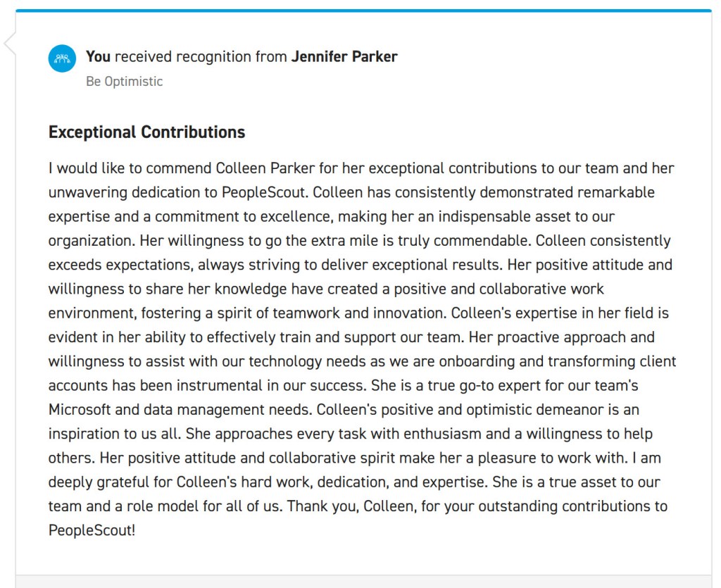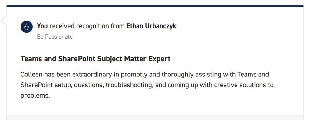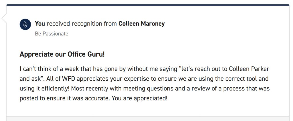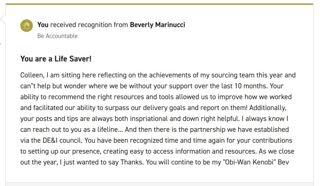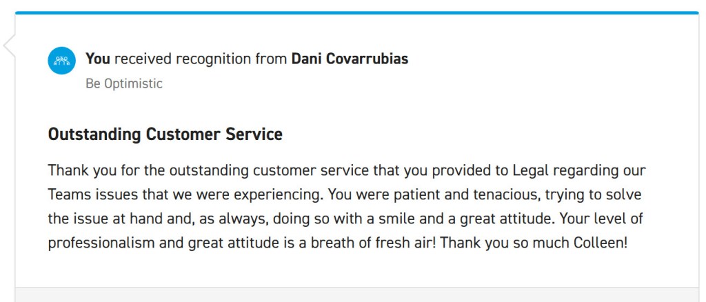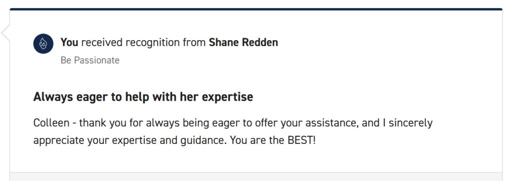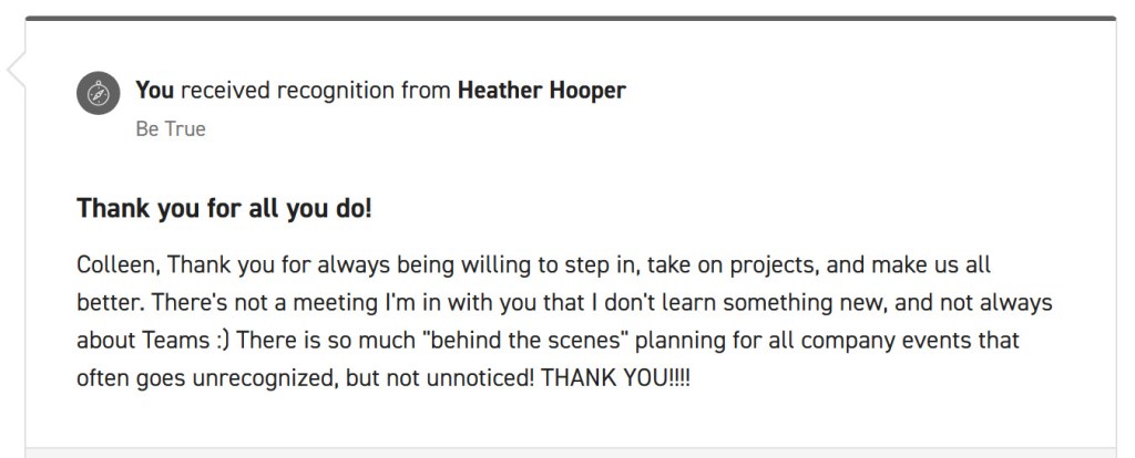 My recent company has a program for gratitude. Each employee can offer notes of gratitude to another colleague for a job well done. I’m proud to say that I’ve received many emails of thanks over the 8 years I worked there. The Gratitude program started just 2 years ago. Here are some of my Gratitude notes: